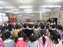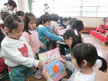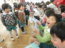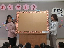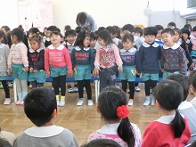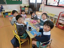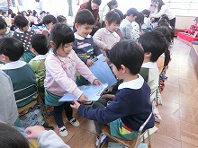 一緒に楽しく過ごしてきた5歳児も、あと2週間で修了の日を迎えます。今日は、こどもお別れ会をしました。「お着替えを手伝ってくれてありがとう」「優しくしてくれてありがとう」と、それぞれの学年から手作りのプレゼントを渡しました。小学生になって使えそうなファイルやバインダーをもらってうれしそうな5歳児です。5歳児からは、掲示板のプレゼントがありました。