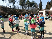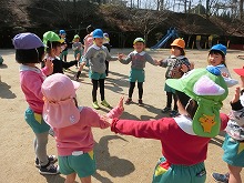 園庭では、なかよしグループと一緒にフォークダンスやふれあい遊びをし、いろんな友達と手をつなぎ、ぬくもりを感じながら楽しく遊ぶことができました。