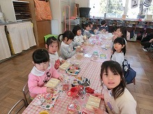 そして、今日はいろんなクラスに分かれて、サンドイッチの会食です。「懐かしい!小さい組さんの時の部屋や!」と、いちご組で食べている5歳児、「2階のばなな組で食べるの初めて!」と嬉しそうな4歳児。いつもと違うお部屋、いろんな友達の中で、和気あいあいと会食ができました。