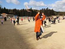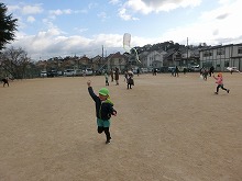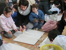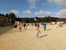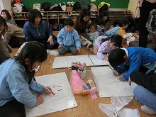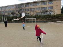 4歳児の参観は親子で「凧作り」をしました。カラーポリ袋に絵を描き、竹ひごをつけ、たこ糸をくくりつけて、オリジナルの「凧」をつくりました。「あがるかなー??」とできあがった凧を持って、いざ小学校の校庭へ!!広い校庭を思いっきり走ると、みんなの作った凧は風を受けて、青空へあがりました。「わ!あがったー!!」とみんなで大喜び。お母さんたちも一緒に走ってくださって、楽しい凧あげ大会を経験できました。保護者の皆さま、ご参加・ご協力をありがとうございました。
