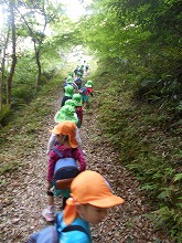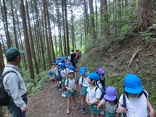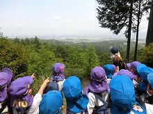 4,5歳児が甘南備山保存会の皆様と一緒に春の遠足に行きました。お天気が心配されましたが、時々日も差して、山の中は心地よい風が吹いていました。4,5歳児は途中まで一緒に手をつないでいきましたが、山ではそれぞれのコースを歩きました。5歳児のコースのヒノキの小径から尾根の小径に行く道では階段がたくさんあり、「1,2、、、、56、57」と、数えながら「いっぱいある」「たいへんやぁ」と楽しんで登りました。尾根の小径では景色が良いところで、「ヤッホー」とみんなで声を出し、元気いっぱいの5歳児です。