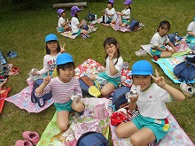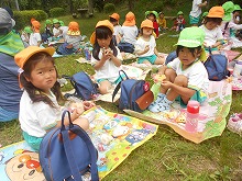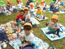 お弁当は、おにぎりお弁当。いっぱい山を散策した子どもたちは、お母さんのおいしいおにぎりをほおばっていました。