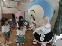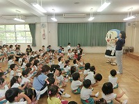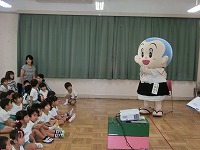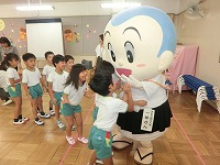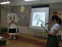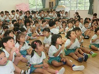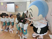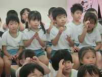 毎月19日は食育の日です。今日は食育教室があり、19日にちなんで、一休さんが幼稚園に来てくれました。子どもたちは、一休さんと一緒に手遊びをしたり、質問をしたりして楽しく過ごしました。野菜のクイズでは、「この花は何の野菜?」の問いに「なずび!」「これは、いちごやな」など、幼稚園で栽培していたので、よく答えることができました。これからも食べ物や栽培物に関心をもち、食べる楽しさを感じながら元気に大きくなってほしいと思います。
