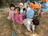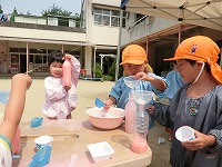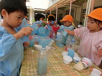 5月だというのに、毎日暑い日が続いています。幼稚園では、子どもたちが、水や砂を使っていろんな感触を楽しみながら遊んでいます。今日は、きれいな色水をジュースにみたてての遊びが大流行り!「みて!こんなジュースできた」「いちごのジュースだよ」と、いろんな色に変化するのが楽しい様子です。砂場では、裸足になって、川や山作りを楽しんでいる子どもたちです。これからの季節、水や泥、砂など開放的な遊びを楽しんでいきたいと思います。