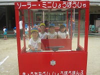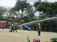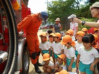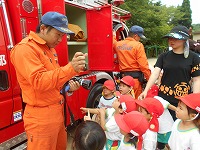 放水訓練を、見せていただいたり、実際にホースを見ながら説明を聞かせてもらい、「すごい、すごい」と、大喜びの子ども達でした。
