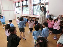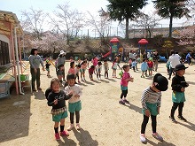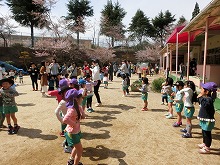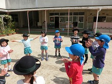 今日は天気も良く、子ども達は「はないちもんめしよう」「かくれんぼしよう」「ドンじゃんけん一緒にしよう」と、新しい友達を誘いあい、久しぶりに園庭は、みんなの元気な声があふれていました。みんなで体操やフォークダンスも楽しみました。