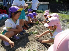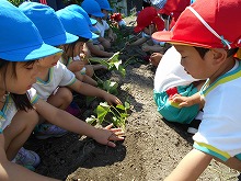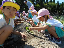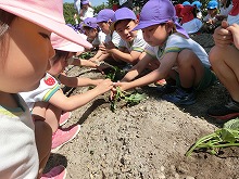 地域の方からお借りしている畑に、さつまいもの苗を植えました。3歳児と5歳児は、「そーっと土をかぶせようね」と、一緒に苗を寝かして植え、土のお布団を優しくかぶせて水やりをしました。