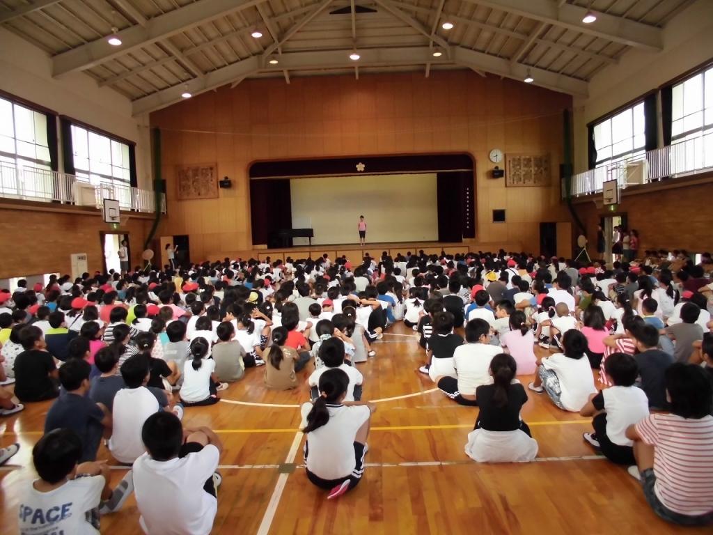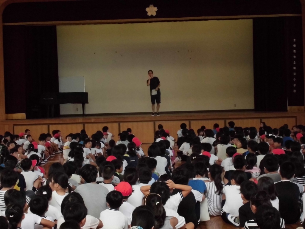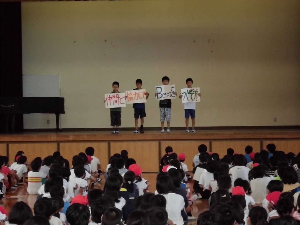運動会のスローガン「仲間と協力してBestをつくそう!」を代表児童が発表しました。