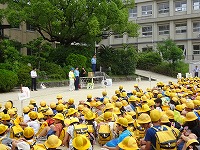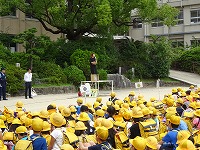 また、一斉下校では、田辺警察署の岩田課長さんからは、不審者への対応(防犯ブザーや笛を使うこと、大きな声で助けを求めること)を教えていただき、練習をしました。