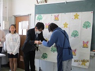 そのあと、日ごろの感謝を込めて図書ボランティアの方々へ感謝状をおくりました。児童はいつも、見やすく整理整頓された図書室に行くことを楽しみにしています。今後もよろしくお願い致します。最後に、保健委員会によるデコレーションマスクの表彰を行いました。