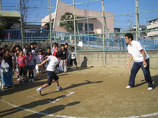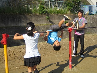 運動場では、グループの代表が逆上がりに挑戦したり、手打ち野球に挑戦しました。
