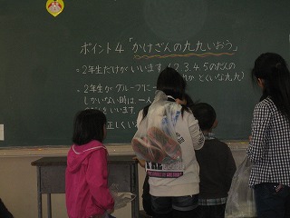 本校では縦割りにし、1グループ7,8人の異年齢集団「ほほえみグループ」を作り、6年生のリーダーを中心に活動を行っています。今回は、このほほえみグループで校内の幾つかのコーナーを回るクイズスタンプラリーを楽しみました。