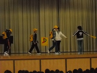 運営委員会から全校児童へのよびかけです。寸劇での訴えに、全校児童も元気よく