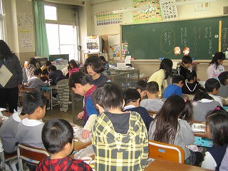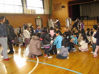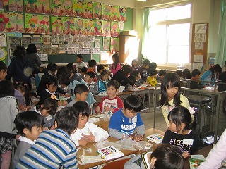 並行して1年生の教室では現1年生がお兄さん、お姉さんとなって新入児の子ども達に手作りけんだまの作り方を優しく教えました。