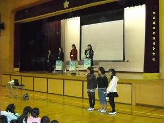 給食の集いでは、調理員の先生、用務員の先生、事務の先生、栄養教諭の先生に対して、子どもたちが日頃の感謝を気持ちを述べました。