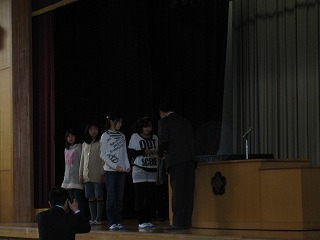 本校児童会運営委員の児童4人が代表して受け取りました。
