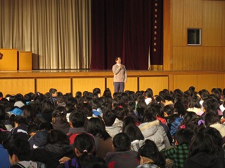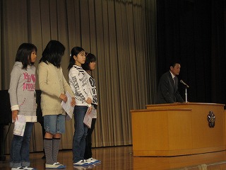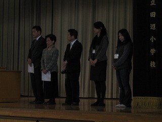 この日の朝礼では、財団法人日本公衆電話会の方から田辺小学校区子ども安心・安全マップを贈っていただく贈呈式が行われました。