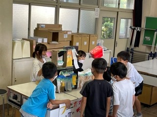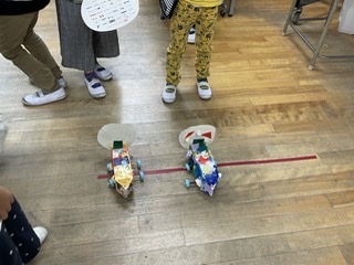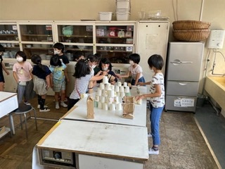 2年生がグループごとに「コロコロ車」「空気砲」「わにたたき」などのおもちゃを作り、1年生たちを招待する「おもちゃフェスティバル」が開催されました。2年生は1年生を楽しませようといろいろ工夫して、長い時間をかけて面白いおもちゃをつくり、教室や体育館、家庭科室などに準備しました。どれもよくできていて、1年生は時間も忘れて、最後まで各会場を回って楽しく遊んでいました。