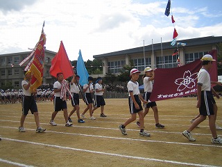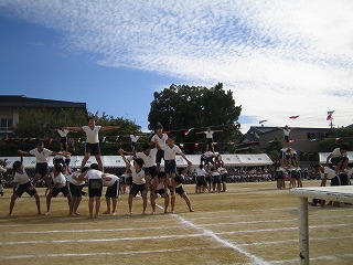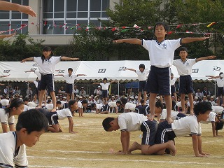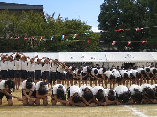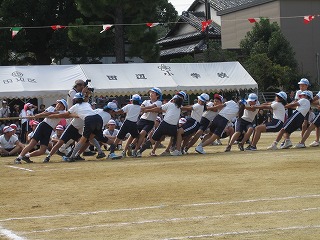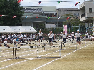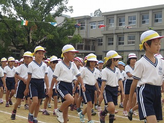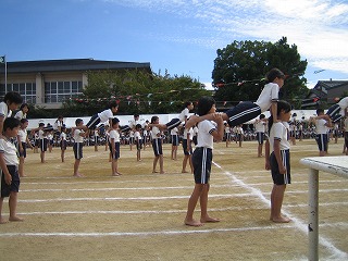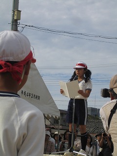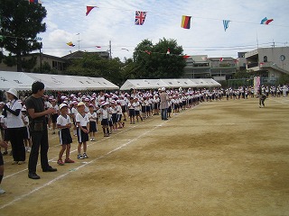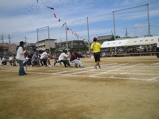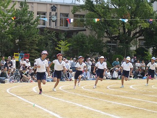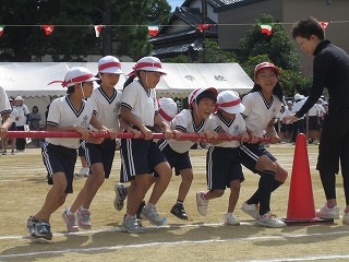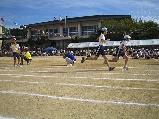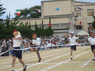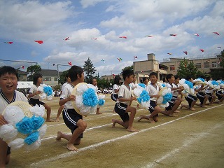 各学年毎に、堂々と入場行進をしました。 応援団長による選手宣誓です。堂々とした宣誓でした。 徒競走のスナップ。みんな全力疾走でした。勝っても負けてもゴール後の顔はみんなすがすがしい笑顔だったのが印象的です。 1,2年生による「ゆめをかなえてドラえもん」。とてもかわいかったです。 6年生による綱引きです。クラス一致団結で縄を引っ張ります。 3,4年生による花笠音頭です。難しい動きでしたが、毎日の練習でどの子も完全マスターし、赤と青と黄の花笠がとってもきれいにそろっていました。また、青空に大きなかけ声が響き渡っていました。 5年生による「じゃんぷ!ジャンプ!JUMP!」障害物であるハードルを飛び越えてゴールをめざします。 児童会種目の田辺っ子「タイフ~ン」。異年齢集団、ほほえみグループ競技です。各色、作戦に作戦を重ね、1年生から6年生までが協力して1本の竹棒をつなぎました。 3年ぶりに復活したPTA競技の「綱引き」。子ども達の応援も大変盛り上がりました。 PTAのみなさんも一緒に全校みんなで田辺音頭を踊りました。参加していただいた皆様。ありがとうございました。 徒競走、ゴールの一コマ! いよいよ高学年の「組立体操・夢に向かって」練習中はなかなか成功しなくて、苦労もしましたが、当日は見事にどのタワーも決まり、拍手喝采でした。 運動会最後の競技、色別対抗リレーです。最後の応援にも熱が入り、大いに盛り上がりました。 閉会式。どの学年もどの子もみんながんばりました。赤、黄、青の順位ではありましたが、どの子にも心の1等賞をあげましょう。 応援に来てくださったすべての皆様、ありがとうございました。