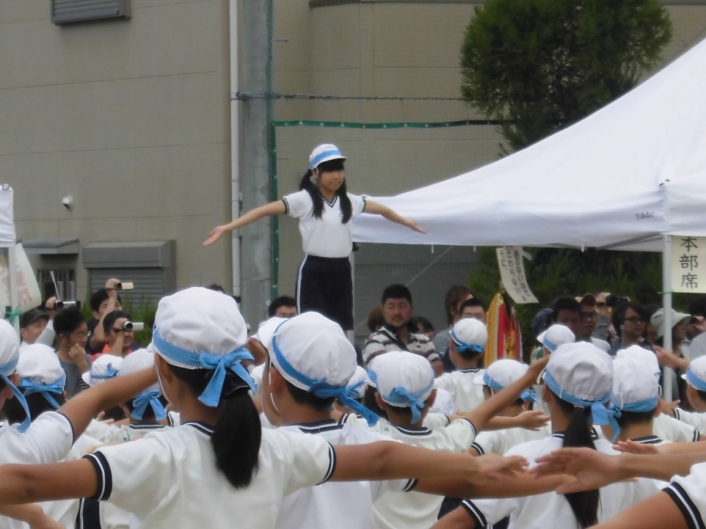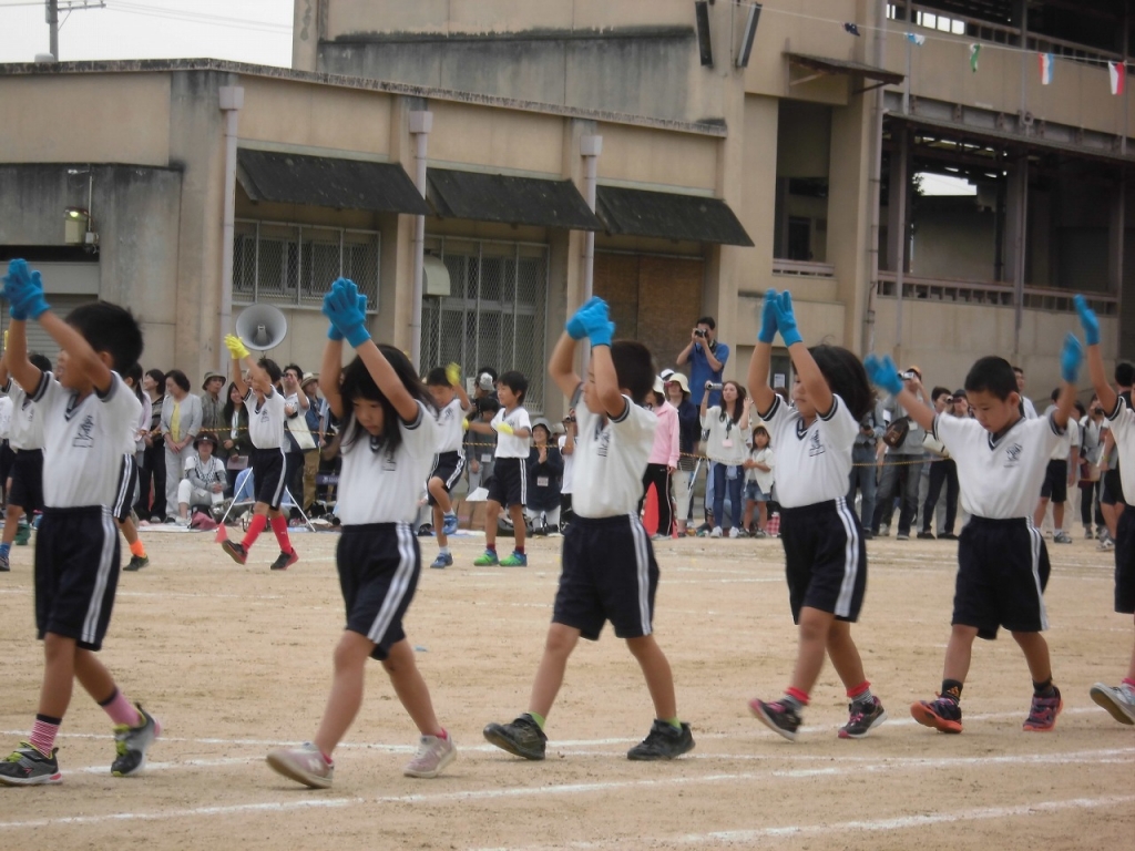 1・2年生の団体演技「TNBキッズ」は、プログラム5番でした。開会式が終わると「はやくじゅんばんがこないかな」とそわそわ…。いざ演技が始まると手足の動きを大きく、力いっぱいみんなで合わせて笑顔で踊ることができました。隊形移動もきれいに決まりました。