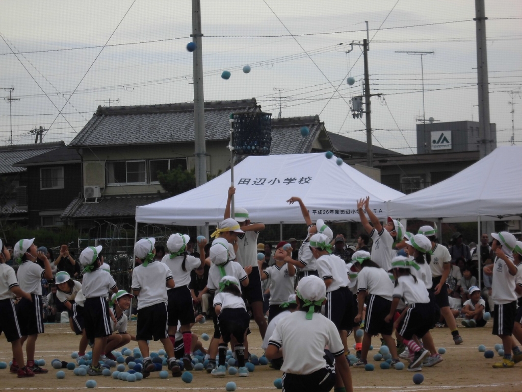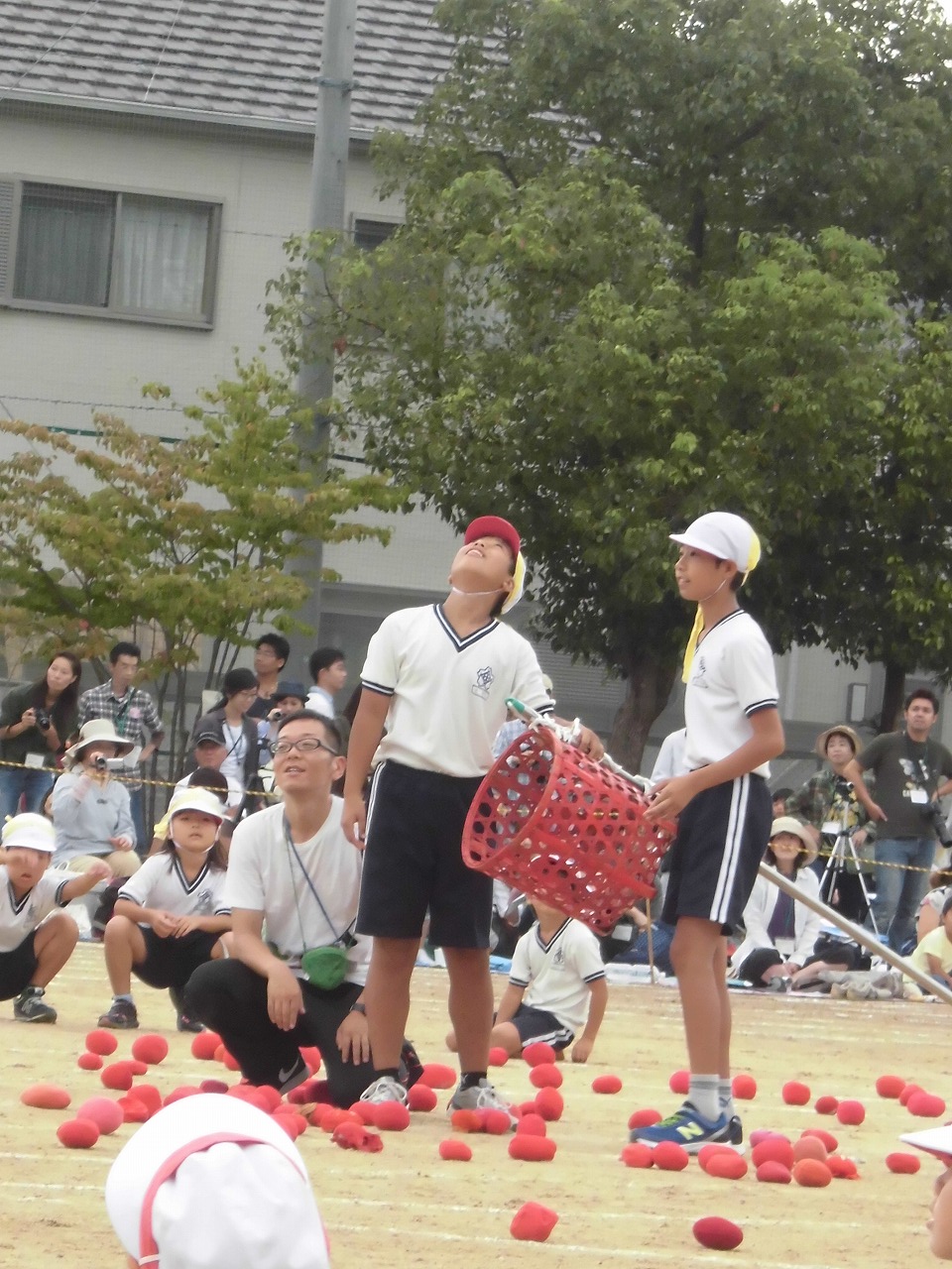 1年生の団体競技「かごいっぱいあつまれ」では、赤と青の玉を追いかけてかごいっぱいになるようねらいをつけて投げ入れました。高学年のお兄さんお姉さんがかごを支えて、玉の数を数えてくれました。