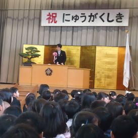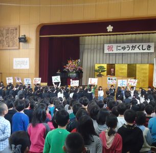 新1年生の100名は、緊張したり不安そうに入場してきましたが、担任による児童一人一人の呼名が行われると、みんなとても元気に大きな声で返事ができました。