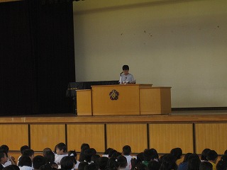 京田辺市はこの3月に非核平和都市宣言を行いました。それを記念として、去る7月25日~26日に市教委の主催で、平和の折り鶴を届ける使者として広島へ小中学生26人が派遣されました。本校からも3人の5年生が参加し、昨日の朝礼でその感想を全校のみんなに伝えました。