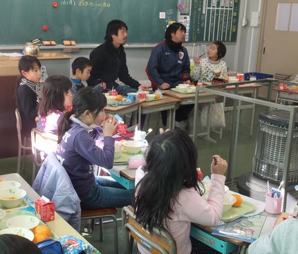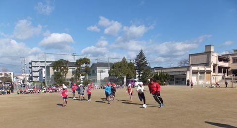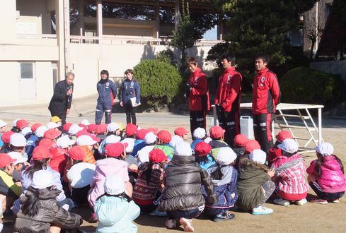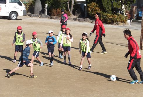 京都サンガF.Cの主力選手が3年生と一緒にサッカーをしました。