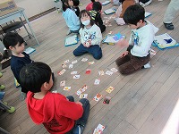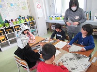 児童は、新聞紙兜、紙鉄砲、お手玉、折り紙、こま回し、カルタの6つのコーナーを順に回っていき、昔遊びを体験しました。