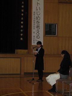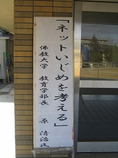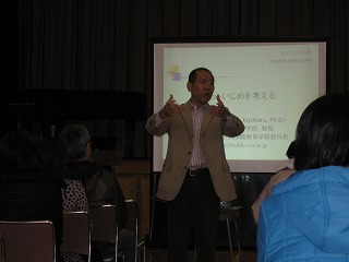 去る12月10日(土)の午前中、本校の体育館にてPTA主催による講演会が開かれました。佛教大学教育学部学部長の原清治先生をお招きし、「ネットいじめを考える」というテーマでお話いただきました。