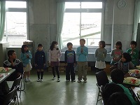 ほほえみグループ(異年齢集団)の割り当ての教室で、グループごとに集まって給食を食べました。1年生から5年生は、自分たちの役割をしっかり行い、6年生と交流を図りました。給食の途中には、6年生に寄せ書きをプレゼントしました。