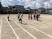 9月10日(火)の昼休みに、5・6年生代表児童による「色別対抗リレー」の練習をしました。