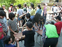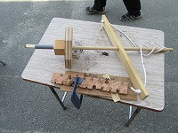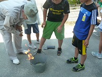 子どもたちが体験したものは、「舞ぎり式」という原始的な道具を使って、木と木をこすり合わせて火種を作ることに挑戦しました。簡単そうに見えて少し難しいですが、火の大切さを感じたことでしょう。