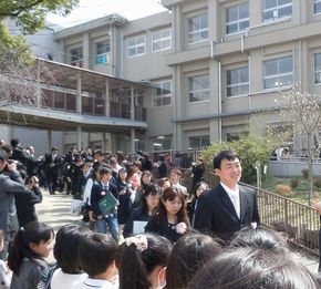 式後、卒業生は、本校のシンボル「済美の鐘」の音を聞いて、学校とお別れをしました。
