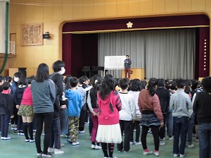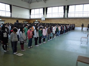 よびかけや礼を何度も練習して、式の心構えを作っていきます。