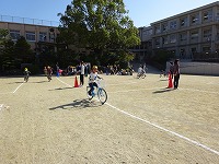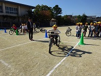 3年生は運動場で曲がり角を曲がるときや自転車を降りるときに注意することを教わり、実際に自転車に乗って体験しました。