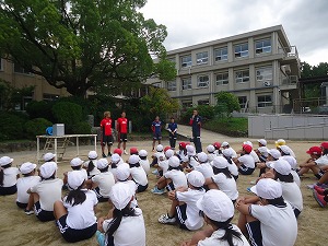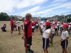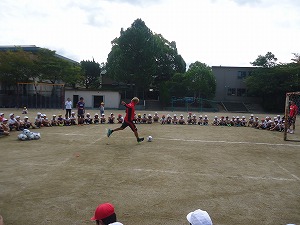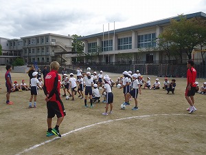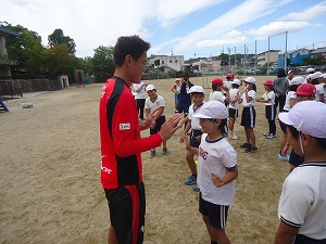サンガFCからは、コーチ、スタッフ、選手が来校され、児童たちとサッカーを通して触れ合いました。