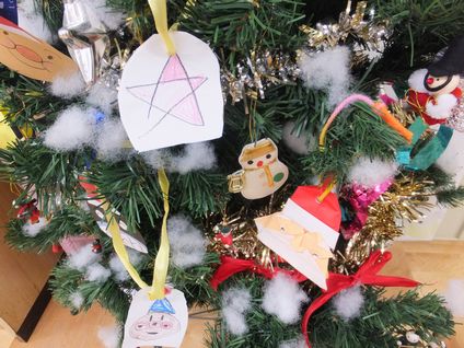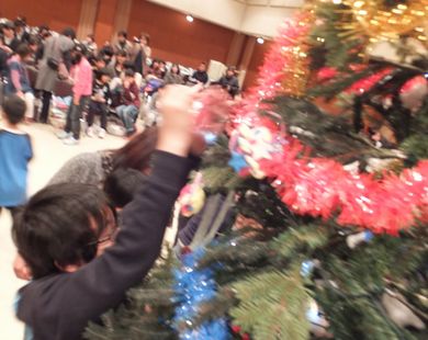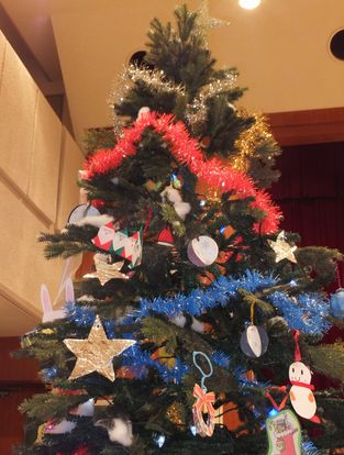 ステージ横の大きなクリスマスツリーに飾りをいっぱいつけて、