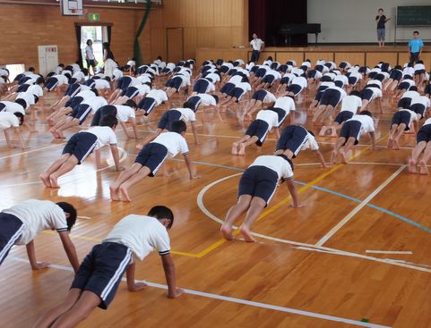 高学年の応援係の指導の下、応援歌や手拍子などの練習をしています。