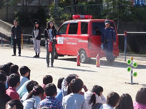 消防署の方にも来ていただき、お話を聞いた後消火器による消火の様子も見学しました。
