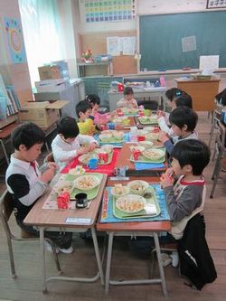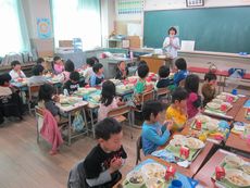 配膳が始まると、みんな大喜び。給食当番の仕事も協力してがんばりました。