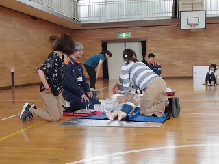 毎年、田辺小学校では水泳学習の前に職員の救急救命実習を行っています。今年度も6月19日(月)から始まる水泳学習に向けて5月25日(木)に職員の救急救命実習を行いました。