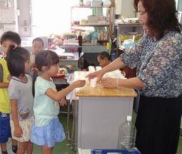 先生に、紙コップに注いでもらいみんなでいただきました。