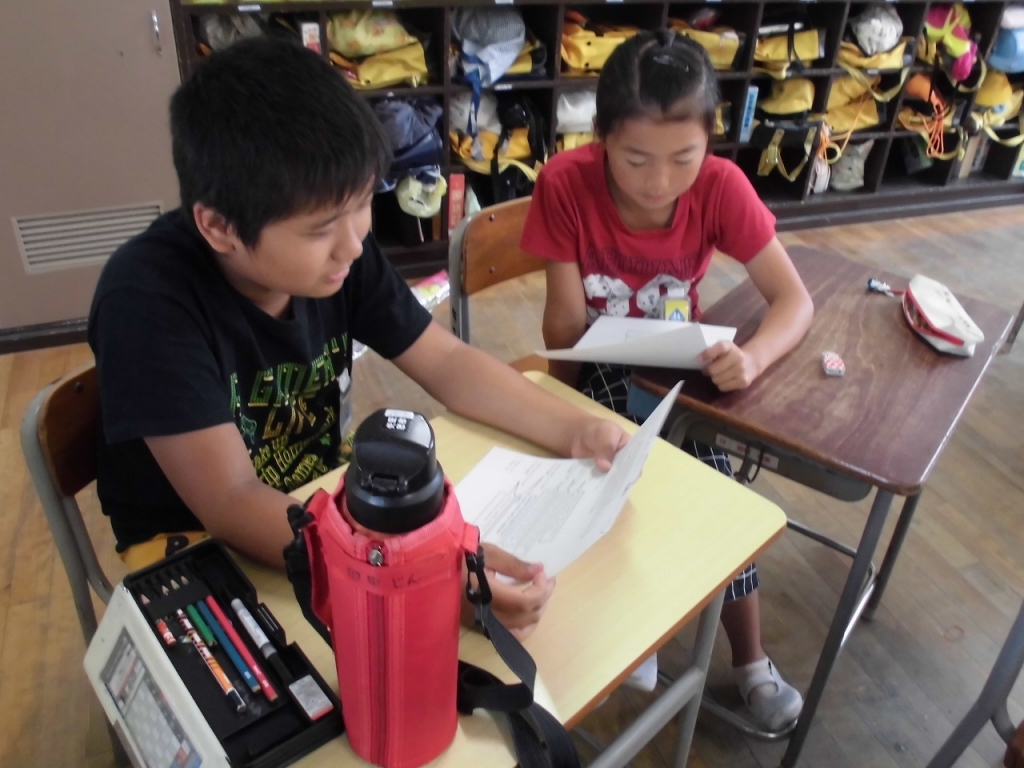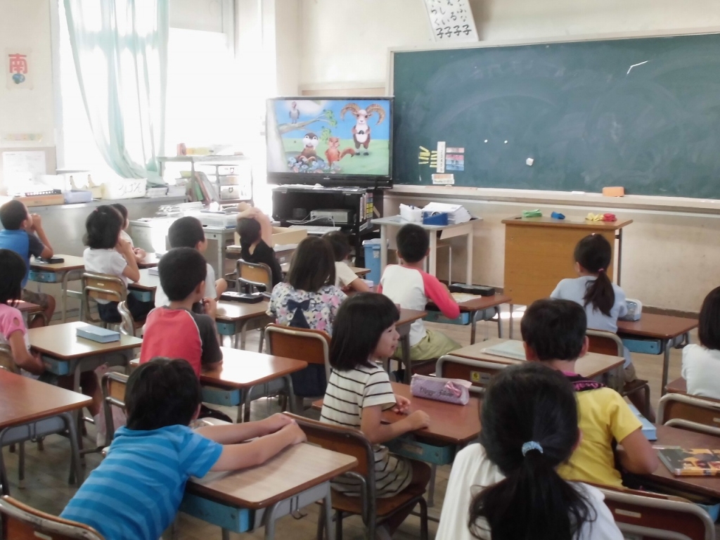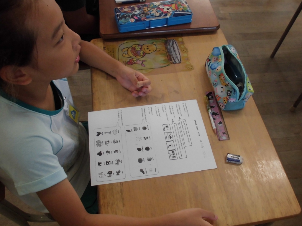 英語での基本的なあいさつややりとりをプリントで勉強したり、動画を見ながら英語の歌を歌ったりしました。