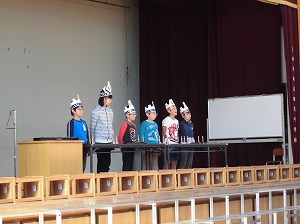 「桃太郎」の英語劇"Peach Taro"をしました。衣装や道具は手作りのものも多く、楽器や歌、劇の役といった各分担のなかで一人ひとりの力が発揮されていました。