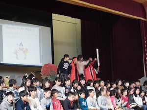 赤おにと青おにのお面をつけて赤おにや青おにの気持ちになって、覚えたセリフと歌を元気に発表しました。