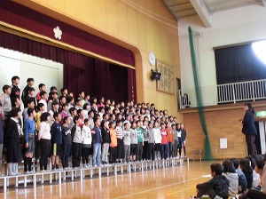 平和をテーマに、「クスノキ」と「海の声」を歌いました。6年生らしく、しっかりと下級生や見ている人の心に訴えかける発表でした。