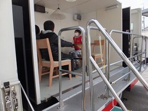 1月24日、6年生は地震を擬似体験できる起震車に乗り込み、大き