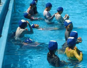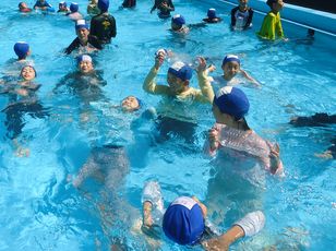 服を着たまま、水の中に入り、普段の水泳学習との違いを体験しました。