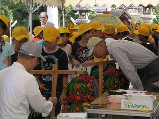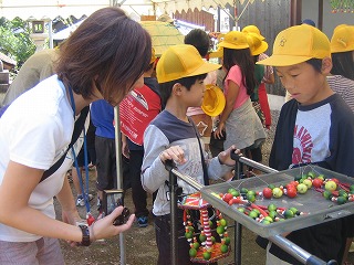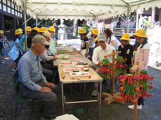 シシトウやキンカン、お米、小豆、なすびなどを飾り装飾します。自由に質問しながら見学しました。
